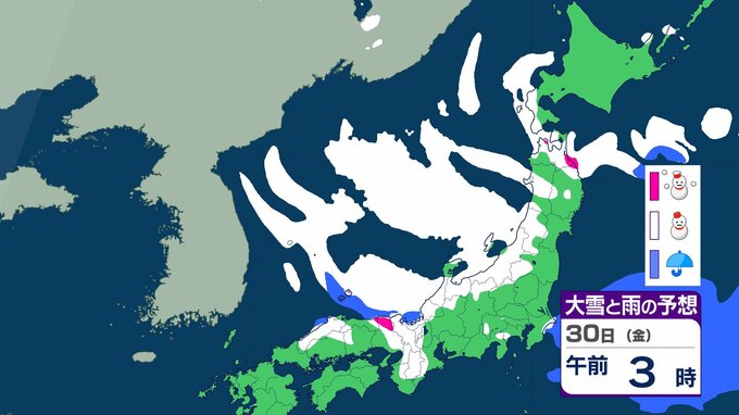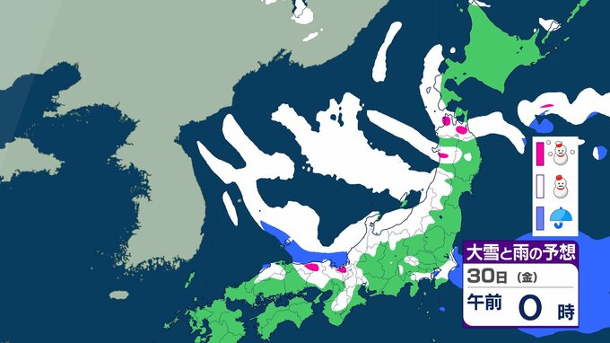 ニュースクリップ 【週間予報】29日(木)から再び強い冬型の気圧配置へ 日本海側は再び “警報級大雪” の可能性も…31日(土)は緩むも2月1日(日)は雨や雪へ【雪と雨のシミュレーション】 2026年1月26日(月) 11:30 国内 天気 30日(金)の雨と雪のシミュレーション