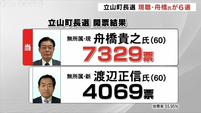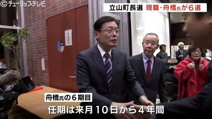 任期満了に伴う富山県立山町長選挙は25日投開票が行われ、現職の舟橋貴之氏が6期目の当選を果たしました。