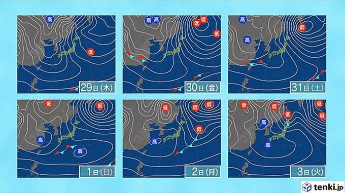気象庁によりますと、2月1日(日)は日本の南の気圧の谷が深くなり、2日(月)は東シナ海にある高気圧が日本の南へ強く張り出すと予測されています。降水確率は31日(土)の北陸で大きく上昇する一方、1日(日)の西日本では低くなる見込みです。