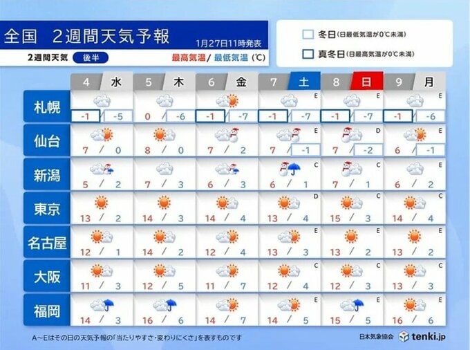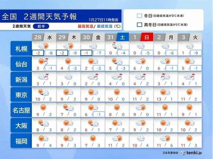 気象庁や日本気象協会 tenki.jp によりますと、北日本と東日本から西日本にかけての日本海側は、曇りや雪または雨の降る日が多くなります。