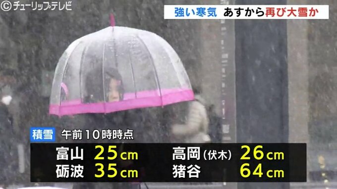 午前10時時点の積雪は富山で25センチ、高岡市の伏木で26センチ砺波で35センチなどとなっています。