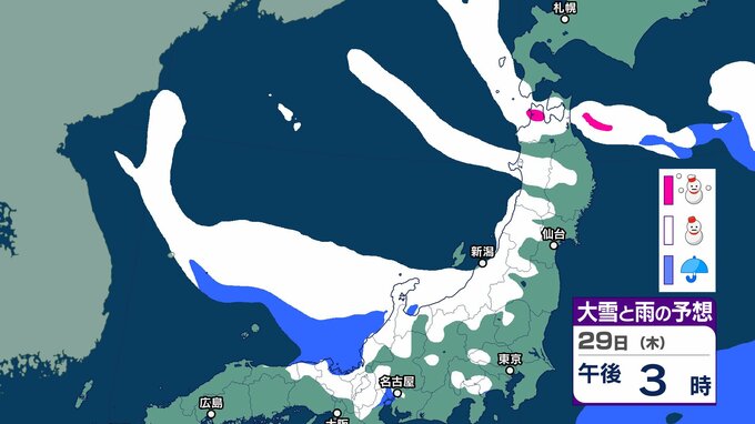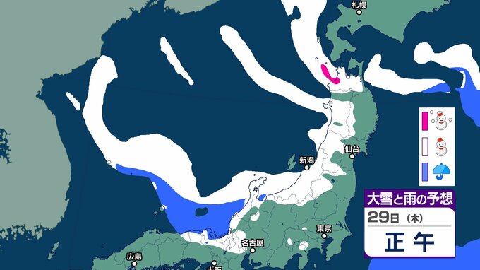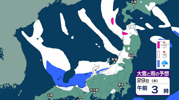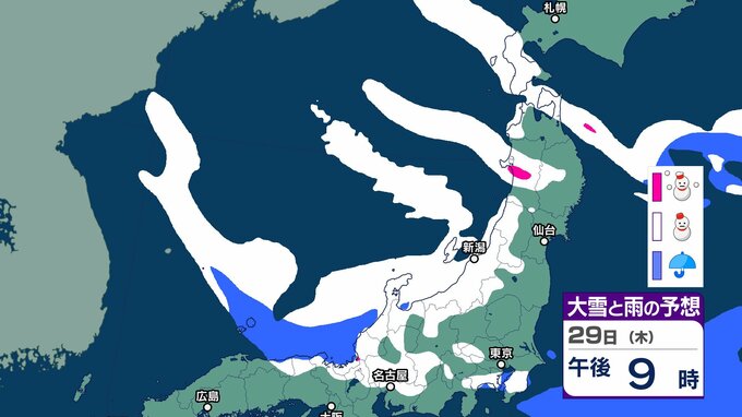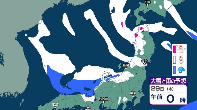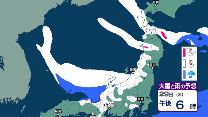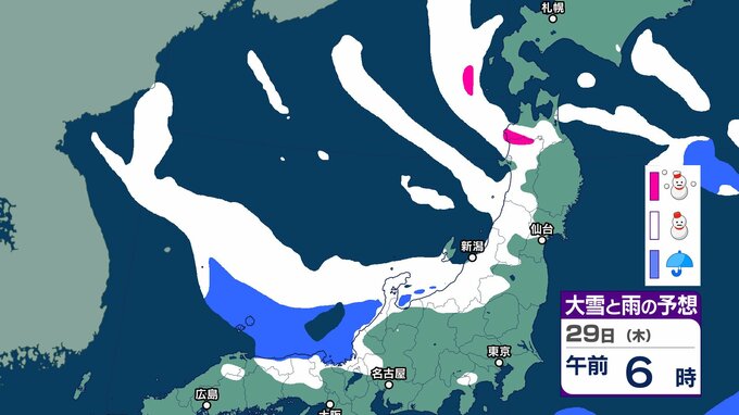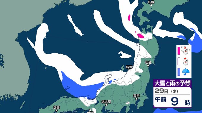 ニュースクリップ 【気象情報】北日本中心…再び強い冬型の気圧配置見込み 2月2日から 北~西日本の日本海側、曇りや雪の日多くなる予想 【雪と雨のシミュレーション】 2026年1月28日(水) 15:44 国内 天気 29日(木)の雨と雪のシミュレーション