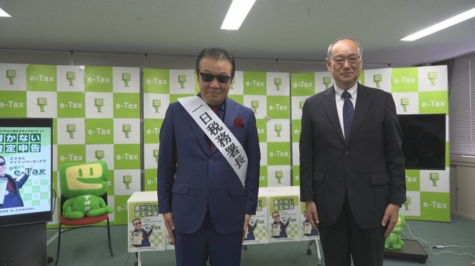 2月16日から確定申告の受付が始まるのを前に、富山市在住のミュージシャン、高原兄さんが富山税務署の一日署長に任命され、スマートフォンで申告ができるe-TaxをPRしました。