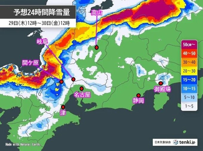 その後、29日午後6時から30日午後6時までに予想される24時間降雪量は多い所で、