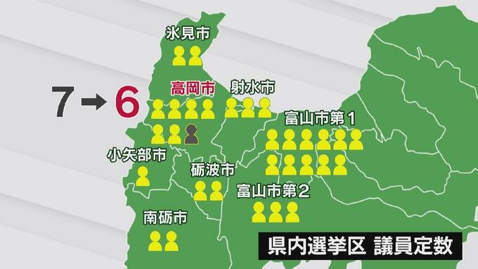 議員定数は、朝日町と入善町をエリアとする下新川郡選挙区を2から1に、高岡市選挙区を7から6に減らし、総定数は、現行の40から38となります。