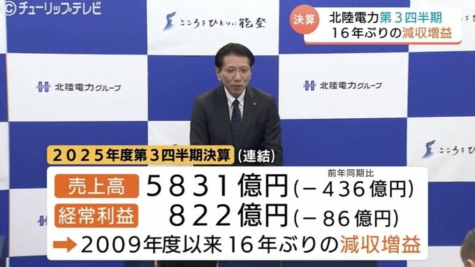 北陸電力は29日、2025年度第3四半期の連結決算を発表し、売上高は前年同期比436億円減の5,831億円となった一方、経常利益は前年同期比86億円増の822億円となり、売上高は減少したものの利益は拡大する “16年ぶりの減収増益” を達成しました。