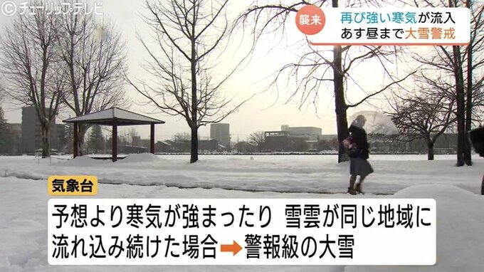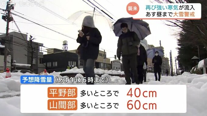 富山地方気象台は、山間部だけでなく、平野部でも大雪となるところがある見込みで、予想より寒気が強まった場合や、雪雲が同じ地域に流れ込み続けた場合には、警報級の大雪となる可能性もあるとしています。