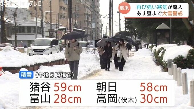 午後5時現在の積雪は、富山市猪谷で59センチ、朝日で58センチ、富山で28センチなどとなっています。