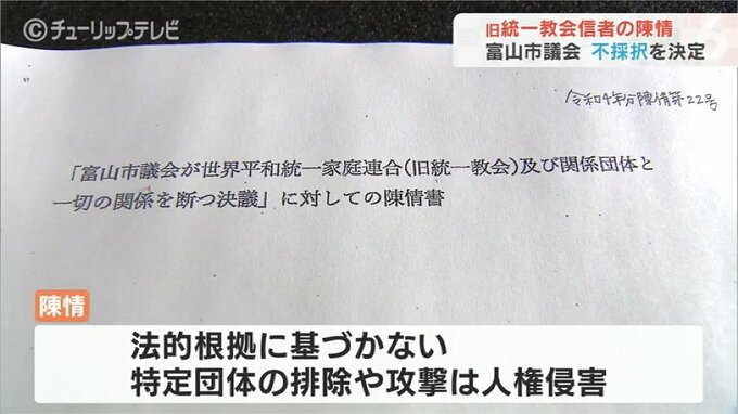 旧統一教会の信者が藤井市長や富山市議会に対して特定団体を排除しないよう求めた陳情について、富山議会は20日の本会議で不採択とすることを決めました。