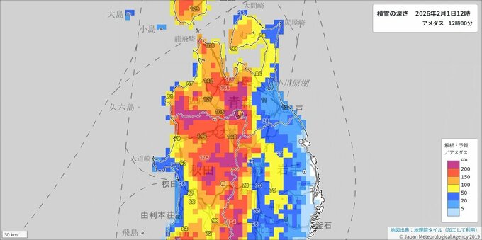 このため、津軽と三八上北では、大雪となる所があるでしょう。発達した雪雲が同じ場所にかかり続けた場合には、警報級の大雪となる可能性があります。