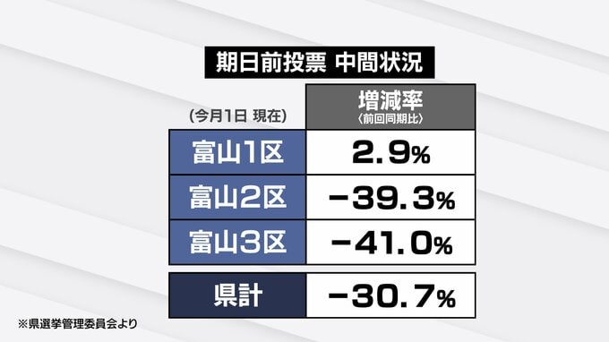 選挙区ごとに見てみると、富山1区は312人増加して2.9%増となっている一方、2区は39.3%減、3区は41%減と前回の衆院選を大きく下回っています。衆院選の期日前投票は今月7日までです。