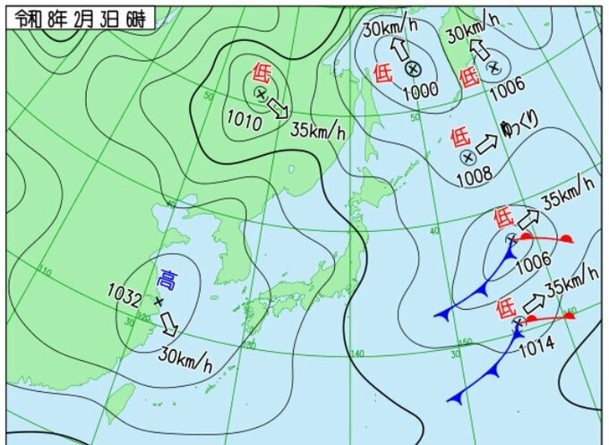 3日の日本付近は冬型の気圧配置の影響を受け、北日本から西日本にかけての広い範囲で大気の状態が不安定となっています。