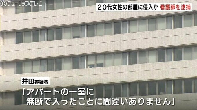 20代の女性が住むアパートの一室に侵入したとして、富山県立中央病院の看護師の男が、住居侵入の容疑で2日、逮捕されました。