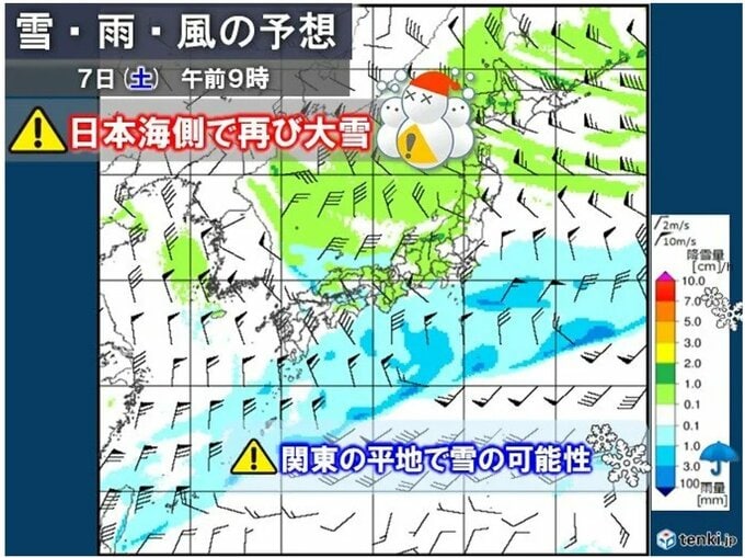 太平洋側でも雪が降る可能性が出てきました。今回の寒波の最大のポイントは、7日から8日にかけての急激な気圧配置の変化です。 大陸の高気圧が日本付近に張り出し、日本付近は「強い冬型の気圧配置」となります。