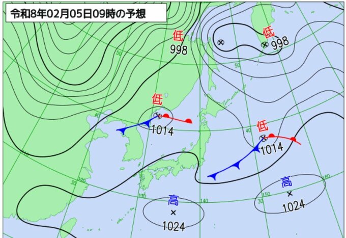 3日夜にモンゴル付近で発生する別の低気圧が、5日朝には日本海中部へ進む見込みです。