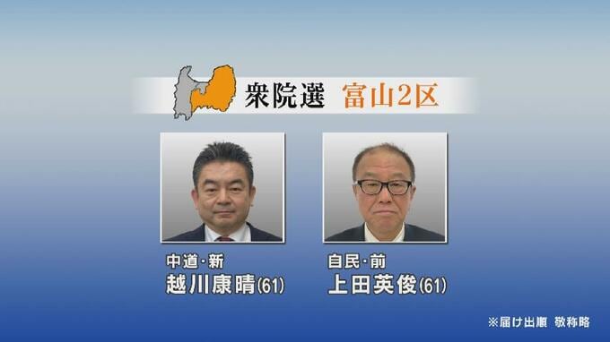 富山2区に立候補したのは届け出順に中道・新人の越川康晴候補(61)、自民・前職の上田英俊候補(61)の2人です。