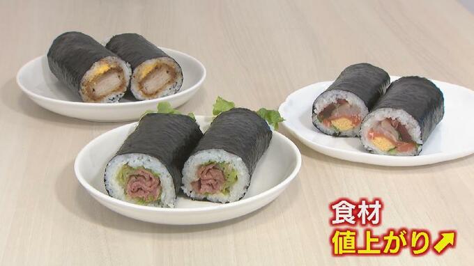 帝国データバンクによりますと、今シーズンは、恵方巻を構成する「コメ」「海苔」の二大材料で価格の高騰が著しいほか、「いくら」や「えび」、「まぐろ」などの水産物、かんぴょうや卵などの価格上昇が続いています。