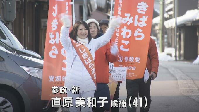 全身真っ白なコーデにオレンジ色のたすき。参政・新人の直原美和子(じきばら・みわこ)候補(41)です。岡山県出身で、化粧品の販売員などを経て8年前、高岡市に移住。現在は、ビジネススクールの取締役を務めています。