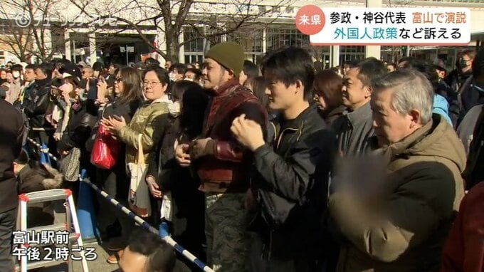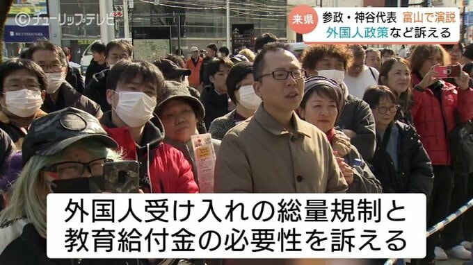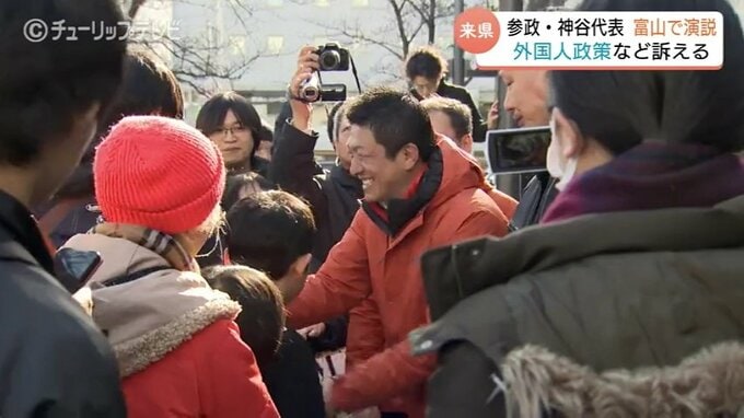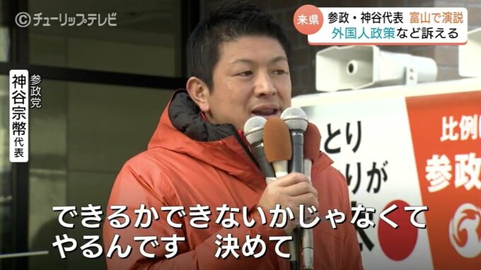 参政党の神谷宗幣代表が4日、富山駅前で街頭演説を行い、消費税減税や外国人政策を訴えました。