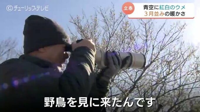「きょうは野鳥を見に来たんです」「ウメの蜜を吸いにメジロっていう鳥も来たりして、そういうのも楽しみの一つ」「あったかくなるのが待ち遠しいですね」