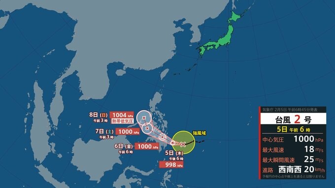 24時間後の5日午後9時には、さらにフィリピンに近づき、中心付近の最大風速は20メートル、最大瞬間風速は30メートルとわずかに発達する予想です。
