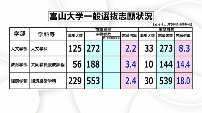 ニュースクリップ 【2026年度入試・富山大学】後期日程「薬学部22.4倍」「経済経営18.0倍」志願状況【4日午後4時時点】医学部医学科は3.0倍【全学部・学科等一覧リスト】 2026年2月5日(木) 15:54 国内 人文学部・教育学部・経済学部