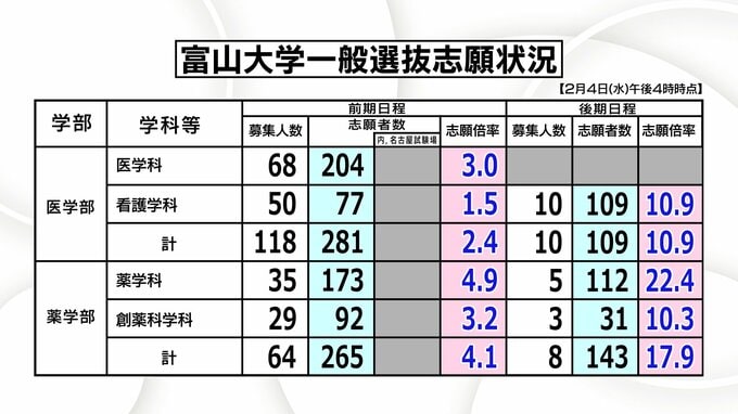 ニュースクリップ 【2026年度入試・富山大学】後期日程「薬学部22.4倍」「経済経営18.0倍」志願状況【4日午後4時時点】医学部医学科は3.0倍【全学部・学科等一覧リスト】 2026年2月5日(木) 15:54 国内 医学部・薬学部