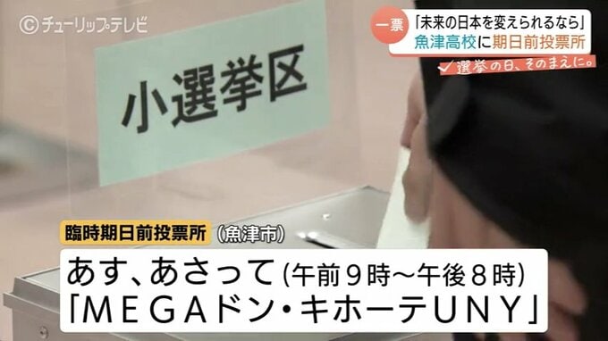 魚津市では、6日(金)7日(土)も大型ショッピングセンター「MEGAドン・キホーテUNY」に臨時投票所が設置されます。
