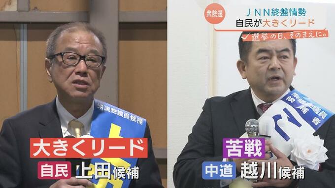 序盤情勢よりもやや差が縮まりましたが、自民・前職の上田英俊候補が大きくリードし、中道・新人で連合富山が支持する越川康晴候補は苦戦しています。