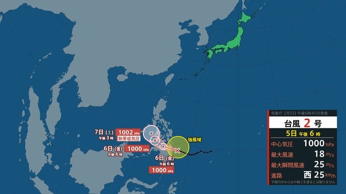 気象庁によりますと、5日午後6時現在、台風2号「ペンニャ」はミンダナオ島の東の北緯8度35分、東経127度25分にあります。