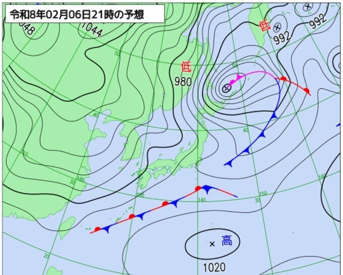 ニュースクリップ 【極寒】冬の嵐ピークへ!マイナス42℃の強い寒気流入 8日にかけて路面凍結や停電に注意…西日本、東日本の太平洋側でも大雪のおそれ、交通障害や暴風雪に警戒【雪と雨と風のシミュレーション】 2026年2月6日(金) 07:00 国内 天気 北日本から西日本の広範囲で大荒れの見込み 北海道地方では6日(金)は暴風雪に警戒し、猛吹雪による視界不良や高波にも注意してください 。 北日本から西日本の広い範囲で、8日(日)にかけて強風や風雪、落雷、竜巻などの激しい突風、ひょうが降る可能性もあります 。 【予想】天気図 6日午後9時 気象庁