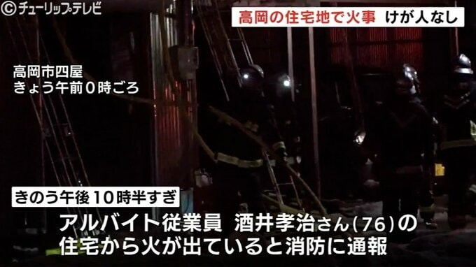 警察によりますと、6日午後10時半すぎ、高岡市四屋にあるアルバイト従業員酒井孝治さん(76)の木造2階建て住宅から火が出ていると、この家に住む人から消防に通報がありました。