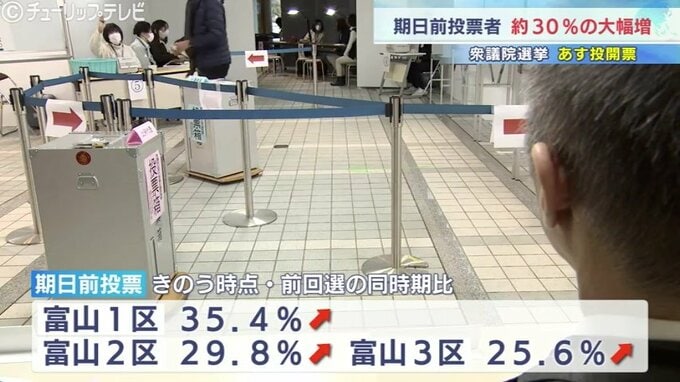 小選挙区ごとでは富山1区が最も多く35.4%増、次いで2区が29.8%増、3区が25.6%増えています。