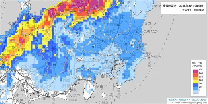 このため、関東甲信地方では広い範囲で雪が降り、山沿いや山地を中心に、平地でも大雪となっている所があります。