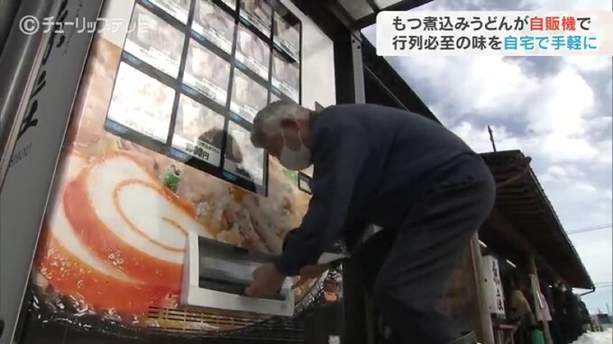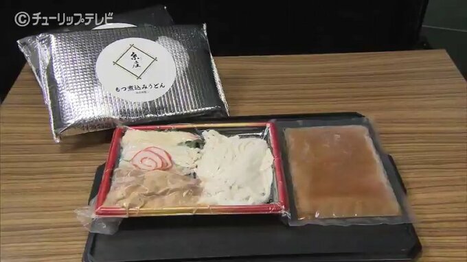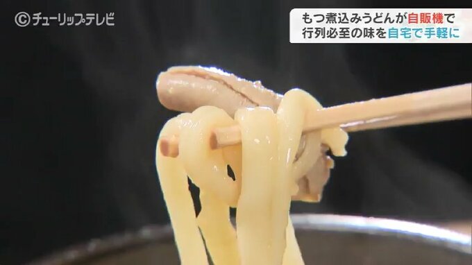 「おうちで糸庄・もつ煮込みうどん。いただきます」「おいしいです。この平打ちの麺、お店通りコシがありますし、モツも柔らかくて。本当にお店の味と何も変わらないですね」