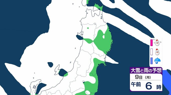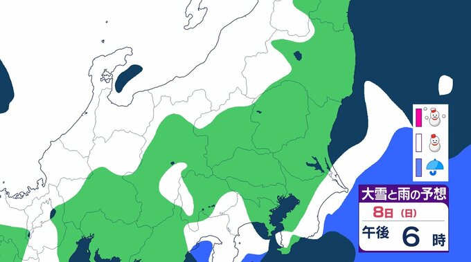 8日午後6時から9日午後6時までに予想される24時間降雪量は多い所で、