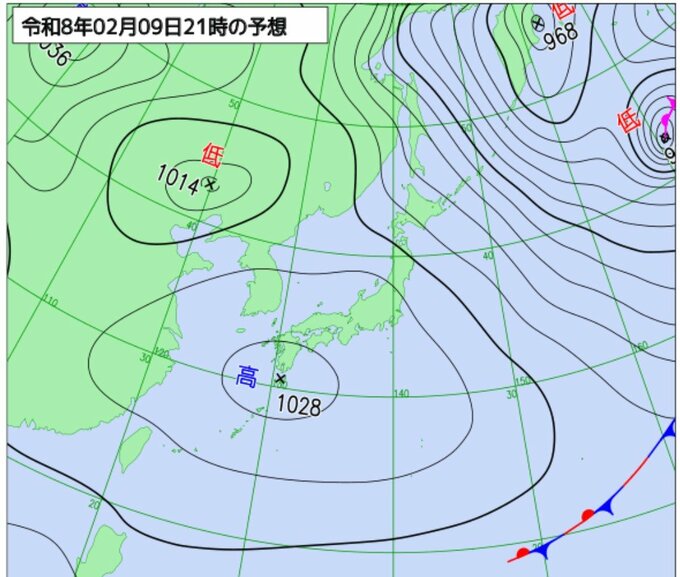 9日(月)は、華中付近にある高気圧が種子島・屋久島付近に移動し、南西諸島や西日本から東日本にかけてを覆う見込みです 。これにより、西から急速に冬型の気圧配置は緩んでいきます 。しかし、北日本を中心に西寄りの風が強く、雪雲の流れ込みが続く見通しです 。