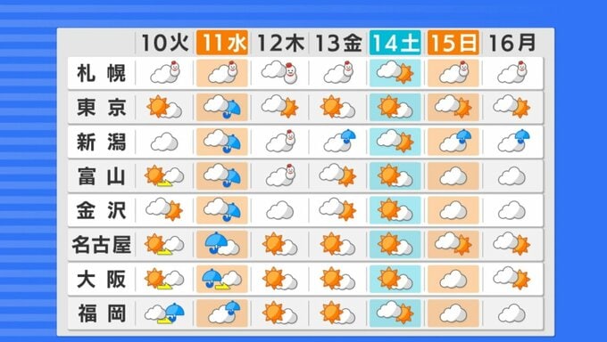 大雨・浸水:東日本から西日本では11日、激しい雨が降り大雨となる所があります。土砂災害、低い土地の浸水、河川の増水に注意してください 。