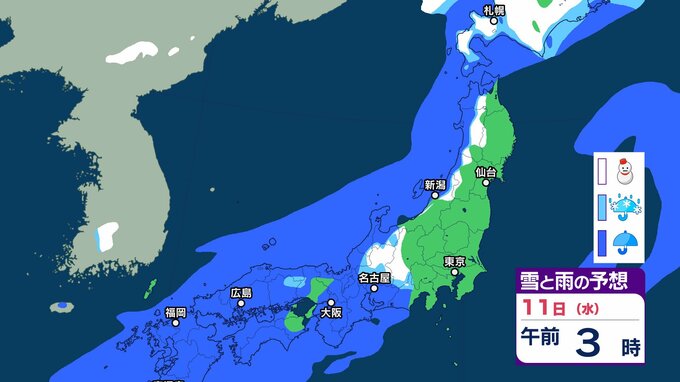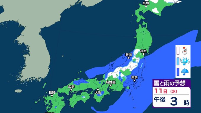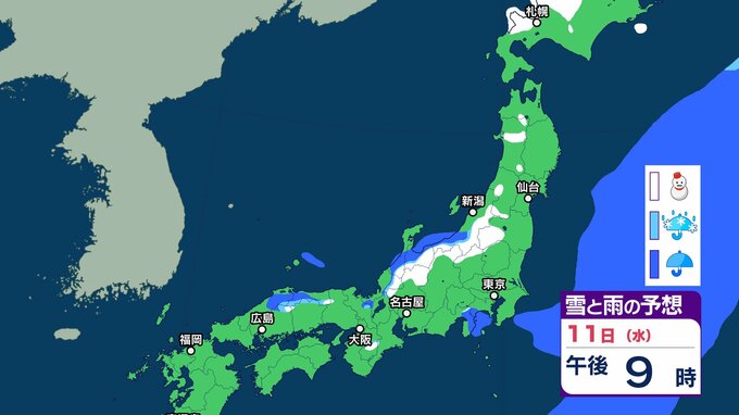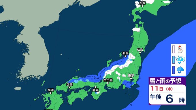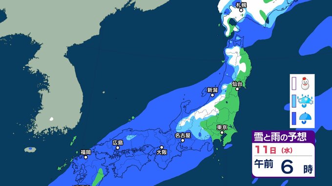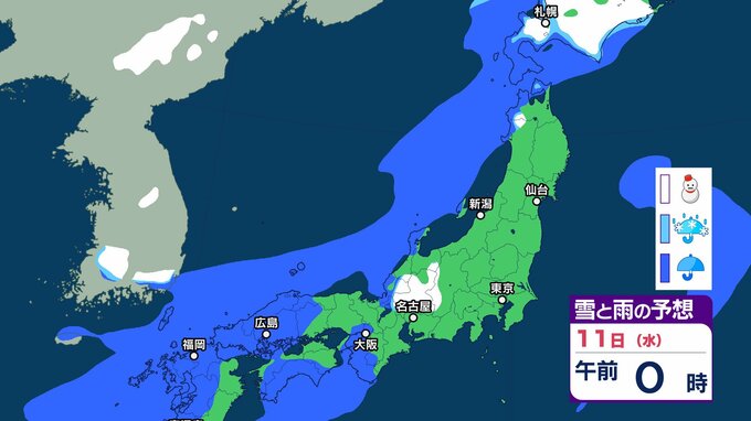 ニュースクリップ あす11日(祝 水)低気圧通過で全国的に大気が不安定 落雷や突風、ひょうに注意…12日(木)西高東低の冬型の気圧配置 北日本は積雪による交通障害に警戒【雪と雨のシミュレーション】 2026年2月10日(火) 17:38 11日(祝 水)雪と雨のシミュレーション