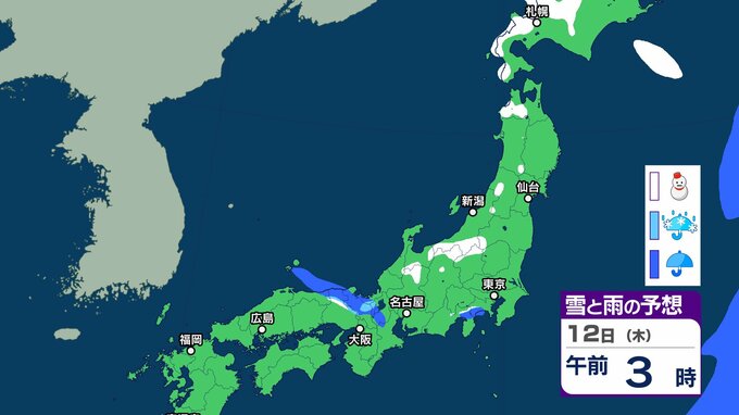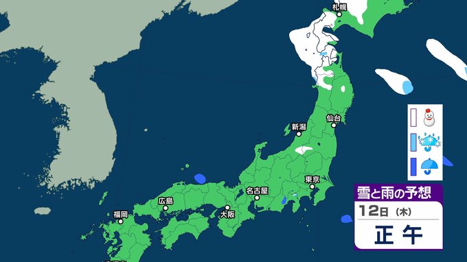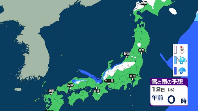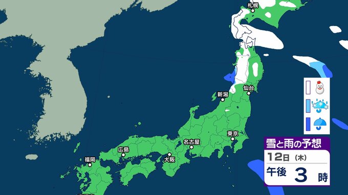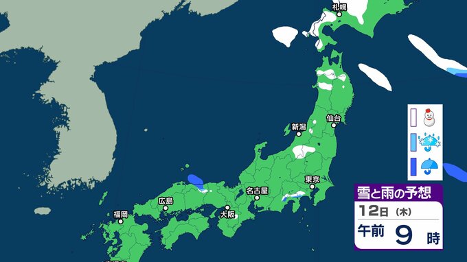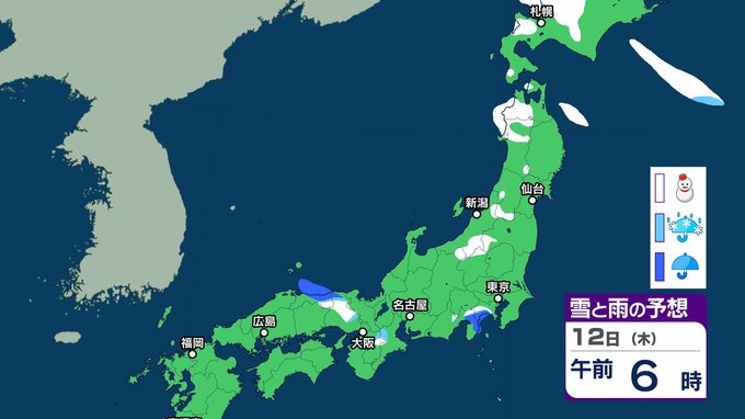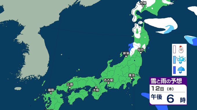 ニュースクリップ あす11日(祝 水)低気圧通過で全国的に大気が不安定 落雷や突風、ひょうに注意…12日(木)西高東低の冬型の気圧配置 北日本は積雪による交通障害に警戒【雪と雨のシミュレーション】 2026年2月10日(火) 17:38 12日(木)雪と雨のシミュレーション
