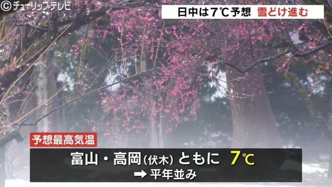 日中の最高気温は富山・高岡市伏木ともに7℃と平年並みの予想で、雪どけが進みそうです。