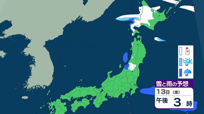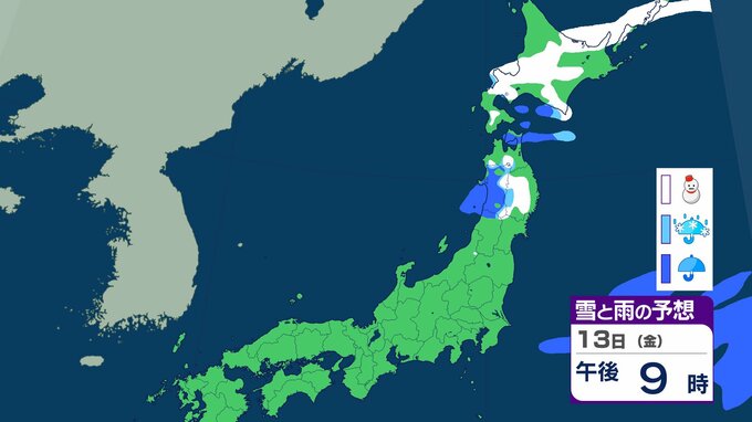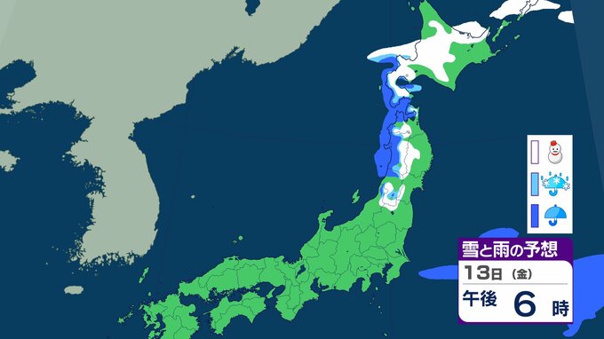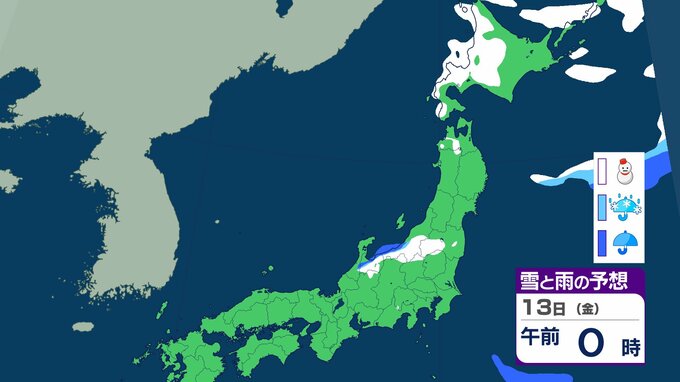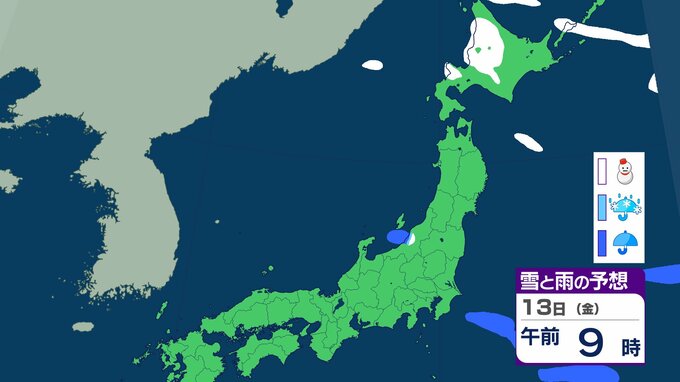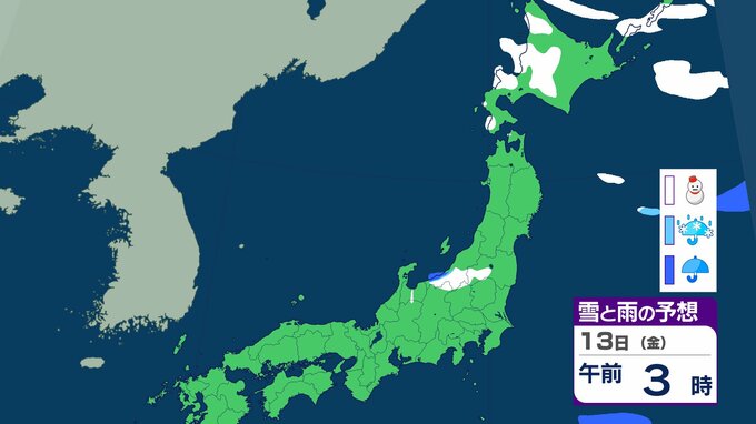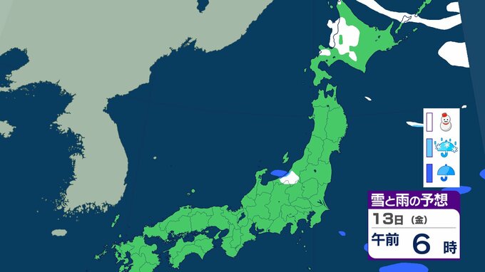 ニュースクリップ 北日本 14日にかけて大雪に注意 北海道は13日朝までに最大30cm降雪か 積雪多い傾斜地では雪崩にも注意【雪と雨のシミュレーション】 2026年2月12日(木) 10:11 13日(金)の雪と雨のシミュレーション