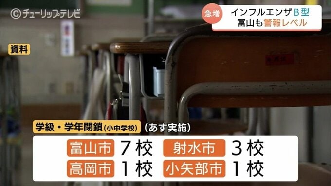 また、12日新たに学級・学年閉鎖の報告があったのは県内の小中学校あわせて12校で、富山市を中心に射水市や高岡市、小矢部市の学校で13日、学級・学年閉鎖を実施するということです。