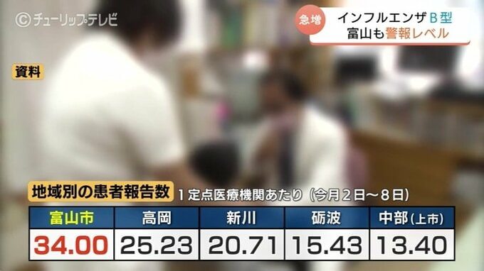 地域別では富山市が1定点医療機関あたり34人と最も多く警報レベルとなる30人を上回りました。次いで、高岡、新川の順となっています。