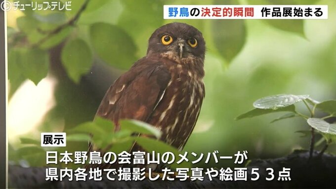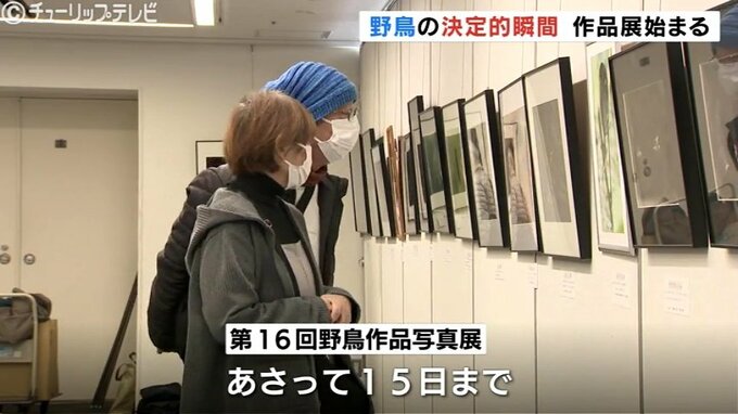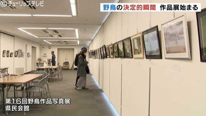 富山市の富山県民会館で始まった「野鳥作品写真展」は、日本野鳥の会富山のメンバーが県内各地で撮影した写真や絵画53点が一堂に展示されていて、今回で16回目となります。