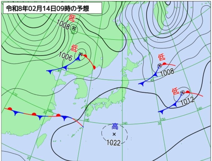 気象庁の予測では、14日(土)夜までに日本海で新たな低気圧が発生し、急速に発達しながら北海道へと進みます。