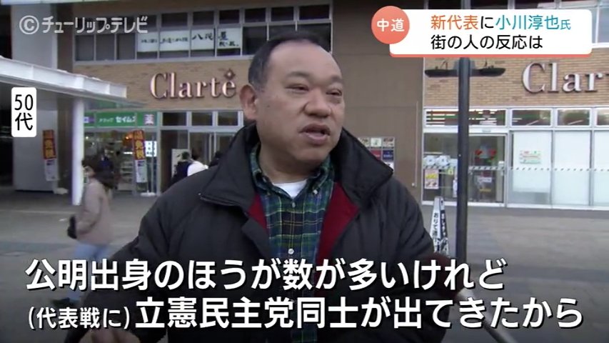 「公明出身のほうが数が多いけれど、(代表戦に)立憲民主党同士が出てきたから、実際運営がどうなんかなとは思いますね。(衆院選で)理想を述べるのに実際とずれている方がたくさんいらしたので、現実に即した対応を、内政も外交もやってほしいなと思う」