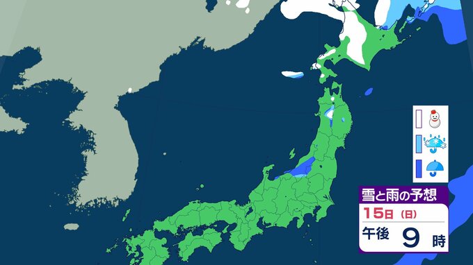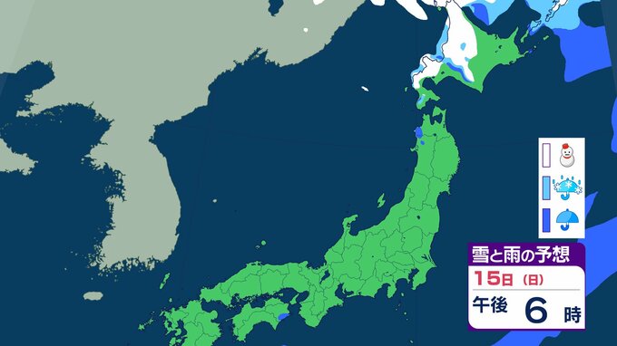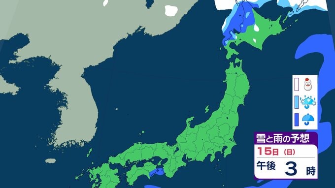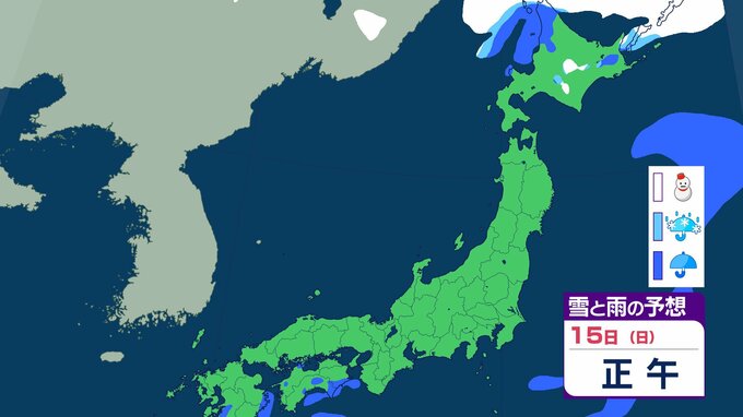 ニュースクリップ 北日本・日本海側 雨や雪の日続く見通し 太平洋側は晴れる日が多い見込み 19~20日にかけて高気圧が本州付近を移動【雪と雨のシミュレーション】 2026年2月15日(日) 13:30 15日(日)の雨と雪のシミュレーション