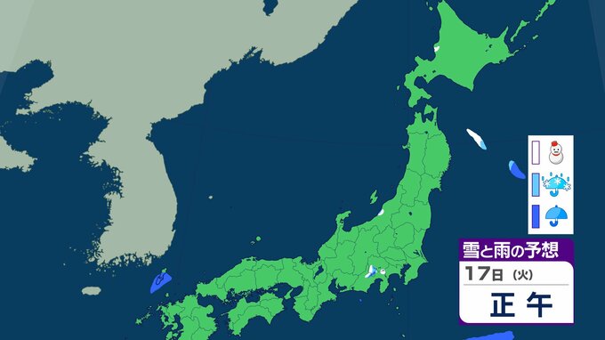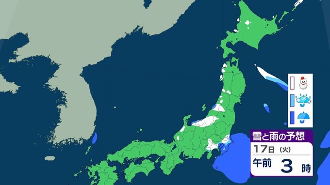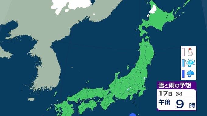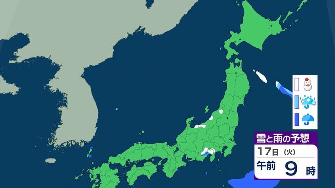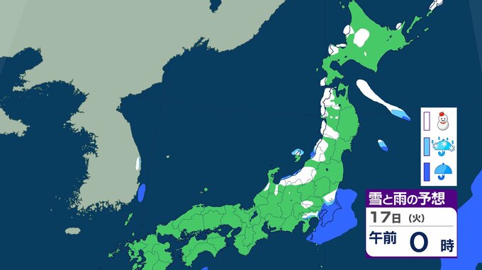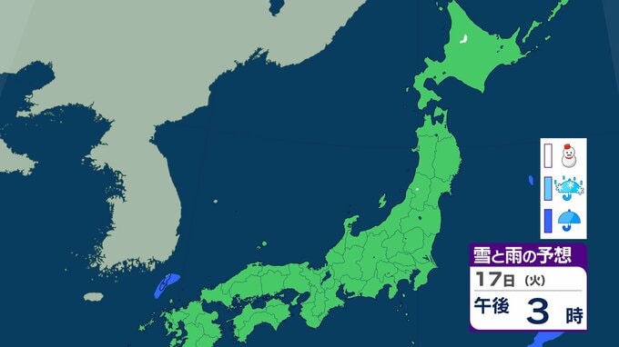 ニュースクリップ 北日本・日本海側 雨や雪の日続く見通し 太平洋側は晴れる日が多い見込み 19~20日にかけて高気圧が本州付近を移動【雪と雨のシミュレーション】 2026年2月15日(日) 13:30 17日(火)の雨と雪のシミュレーション