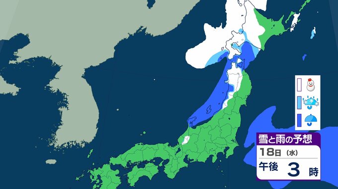 ニュースクリップ 北日本・日本海側 雨や雪の日続く見通し 太平洋側は晴れる日が多い見込み 19~20日にかけて高気圧が本州付近を移動【雪と雨のシミュレーション】 2026年2月15日(日) 13:30 18日(水)の雨と雪のシミュレーション